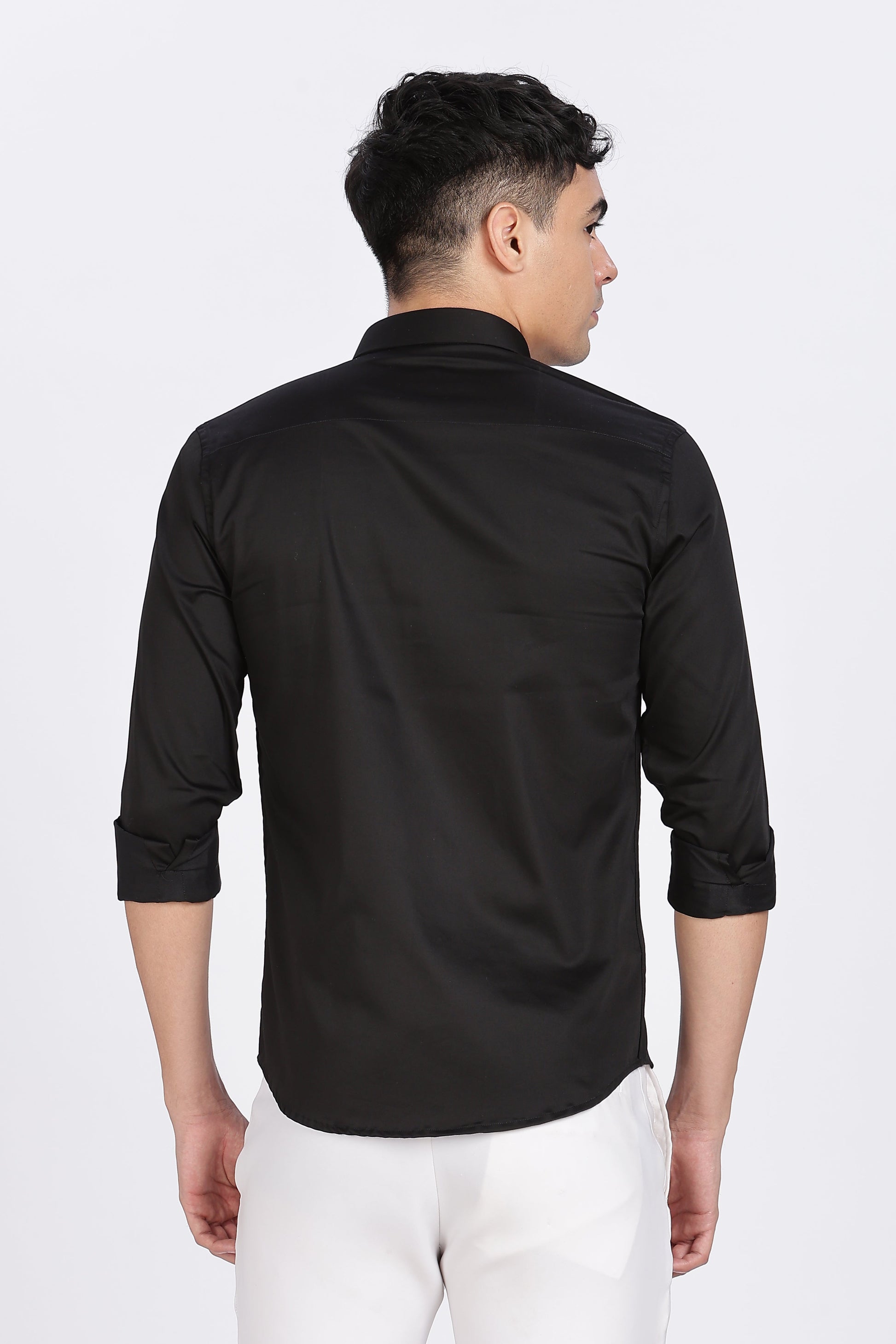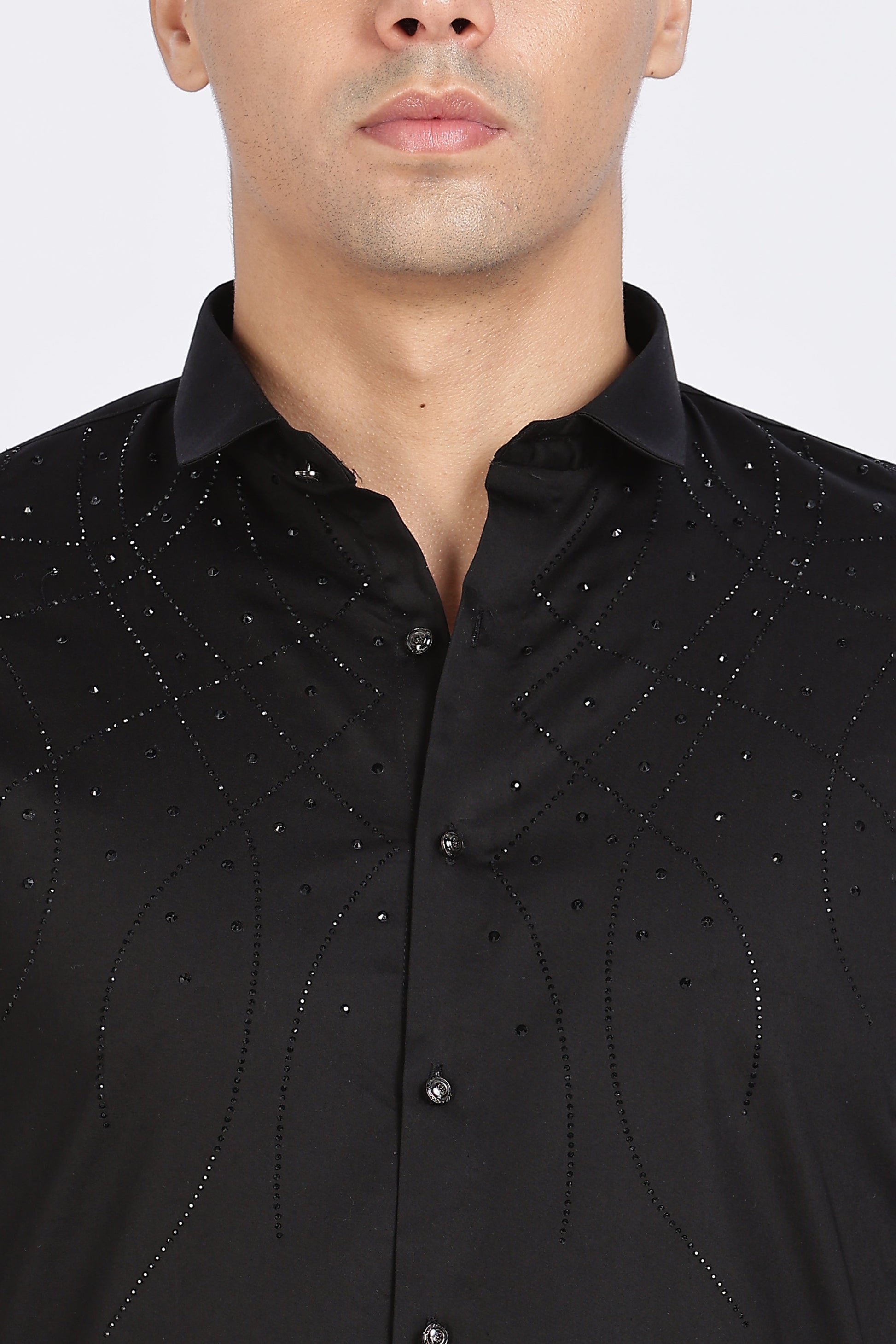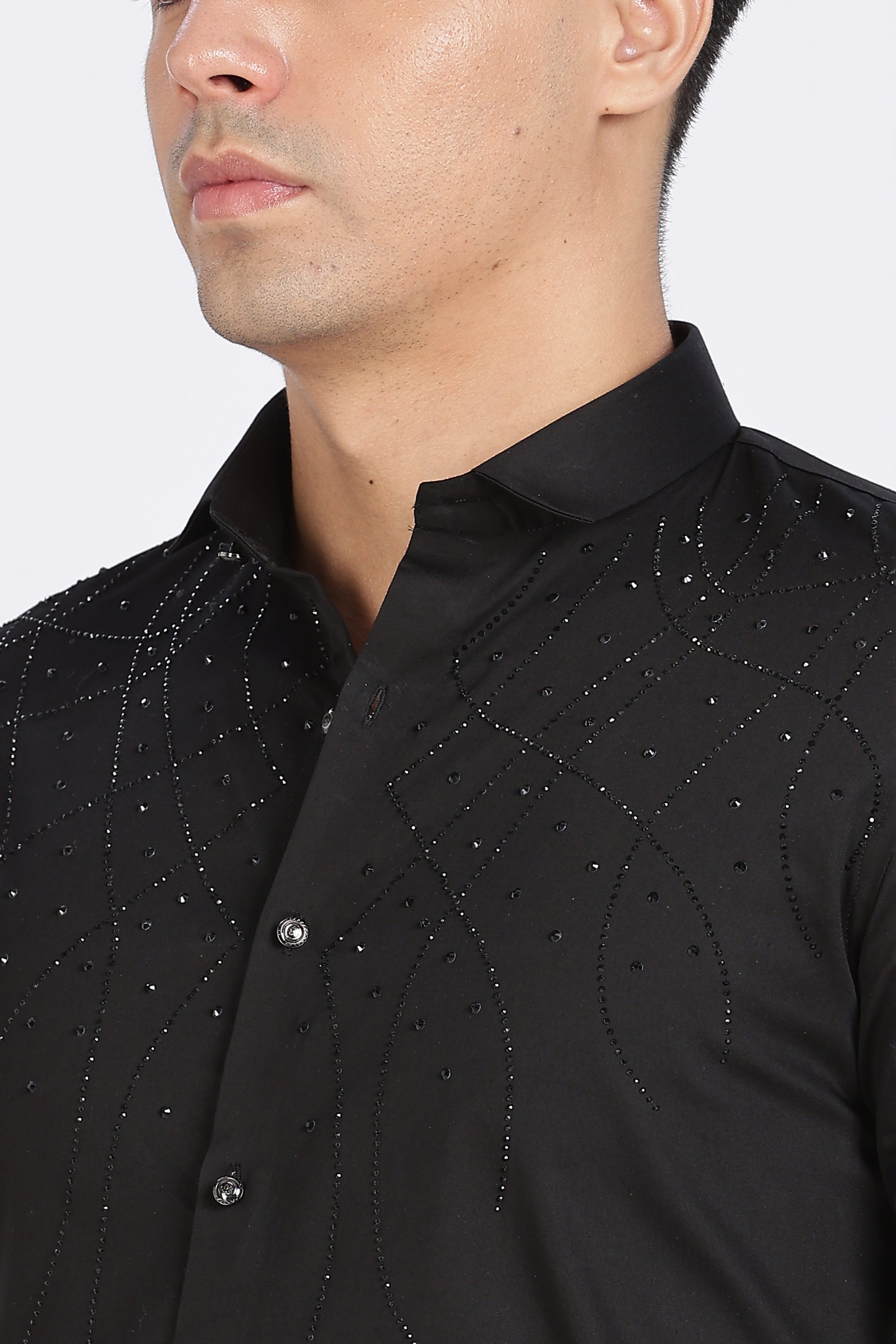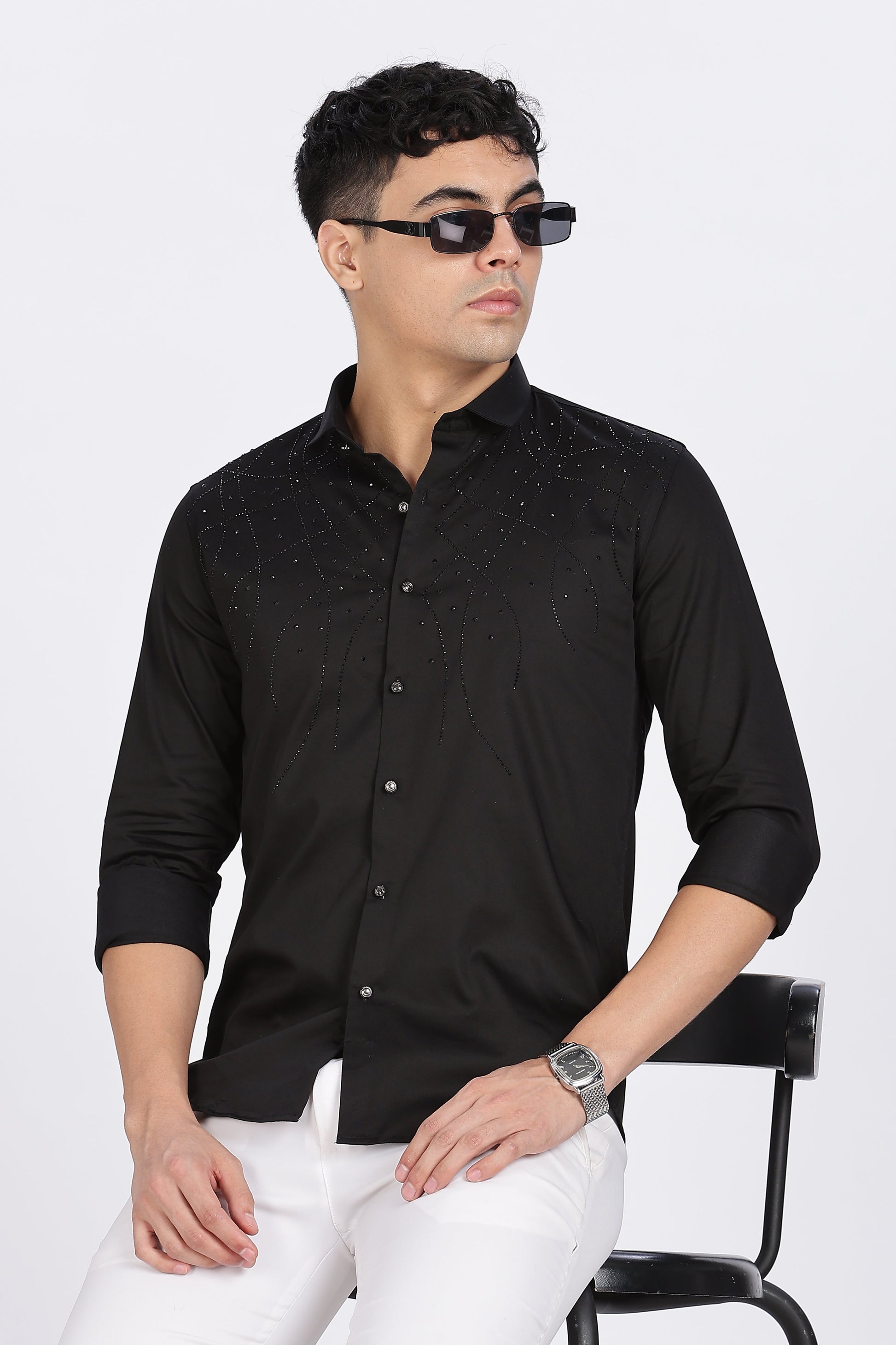 Black men's designer shirt with intricate handiwork or embellishments, particularly noticeable on the shoulders and upper chest area, resembling a starry or galaxy pattern. It features full sleeves and a spread collar. This type of shirt is typically designed for clubwear or partywear.