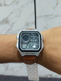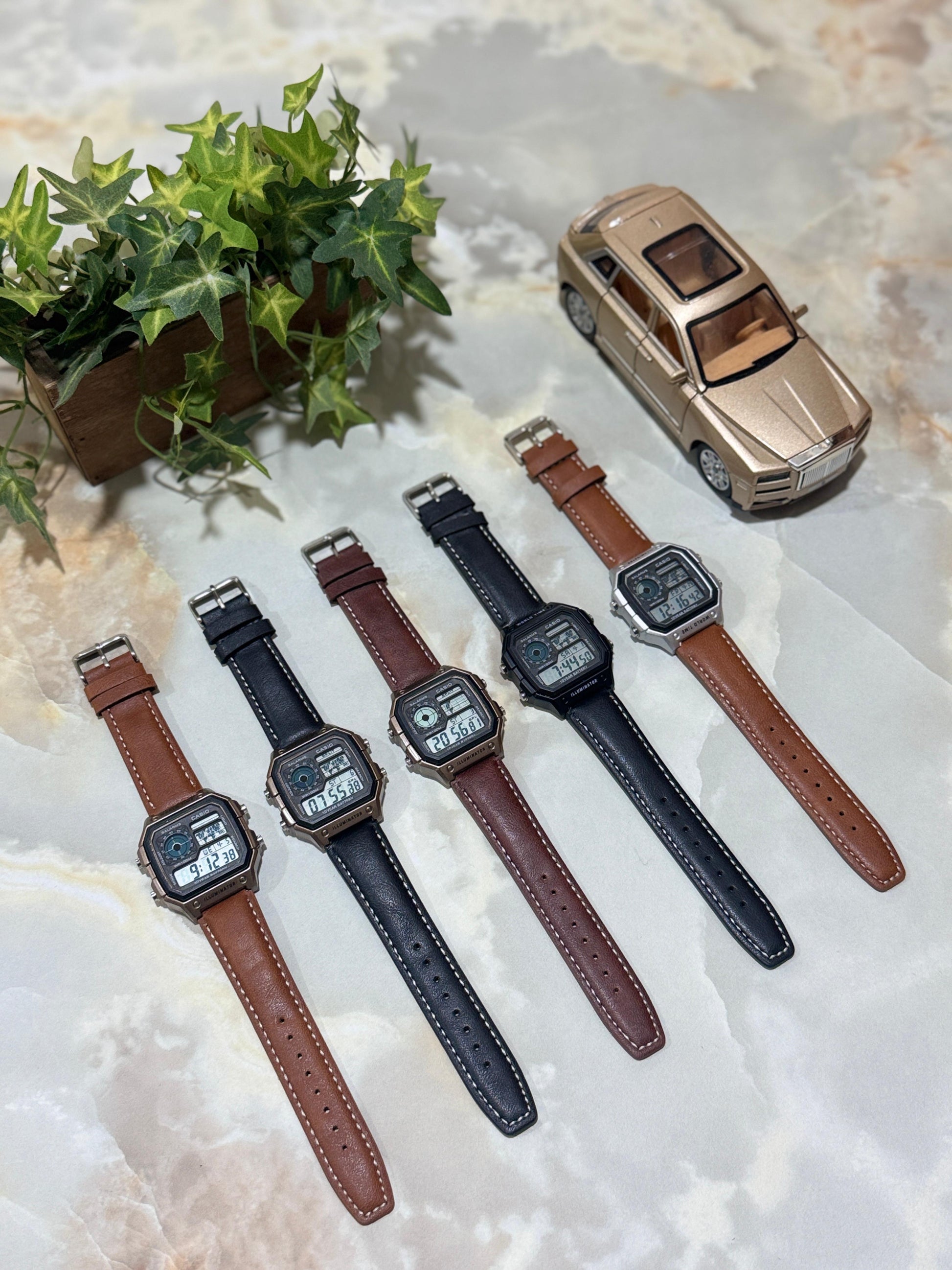 Retro style and practical functionality. It features multi-time zone display with a world map, stopwatch, countdown timer, five alarms, and an LED backlight.