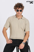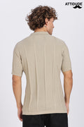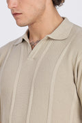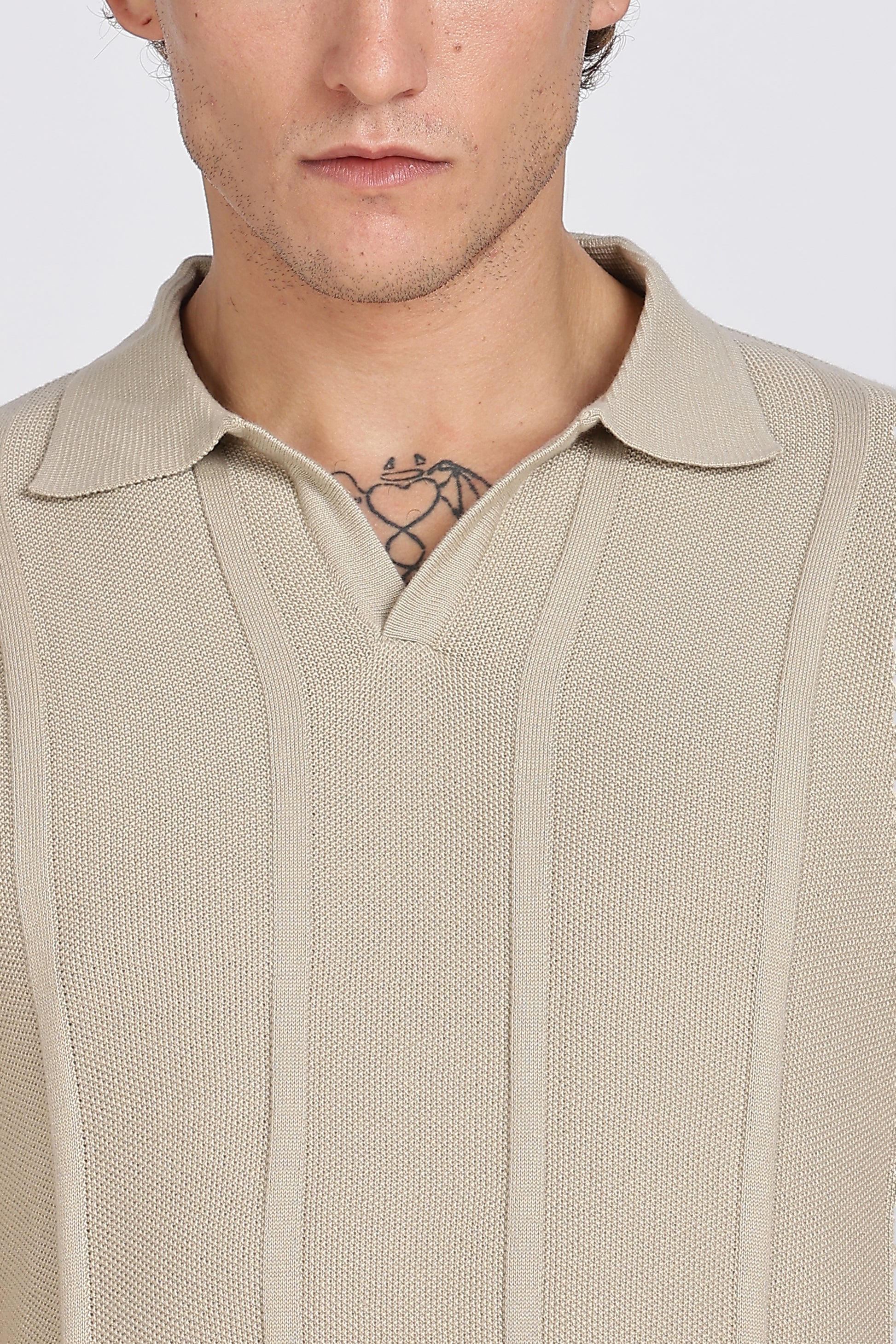 A sophisticated Johnny collar and buttonless V-neck give it a confident, retro vibe, while the distinctive vertical ribbed panels create a textured look that stands out.