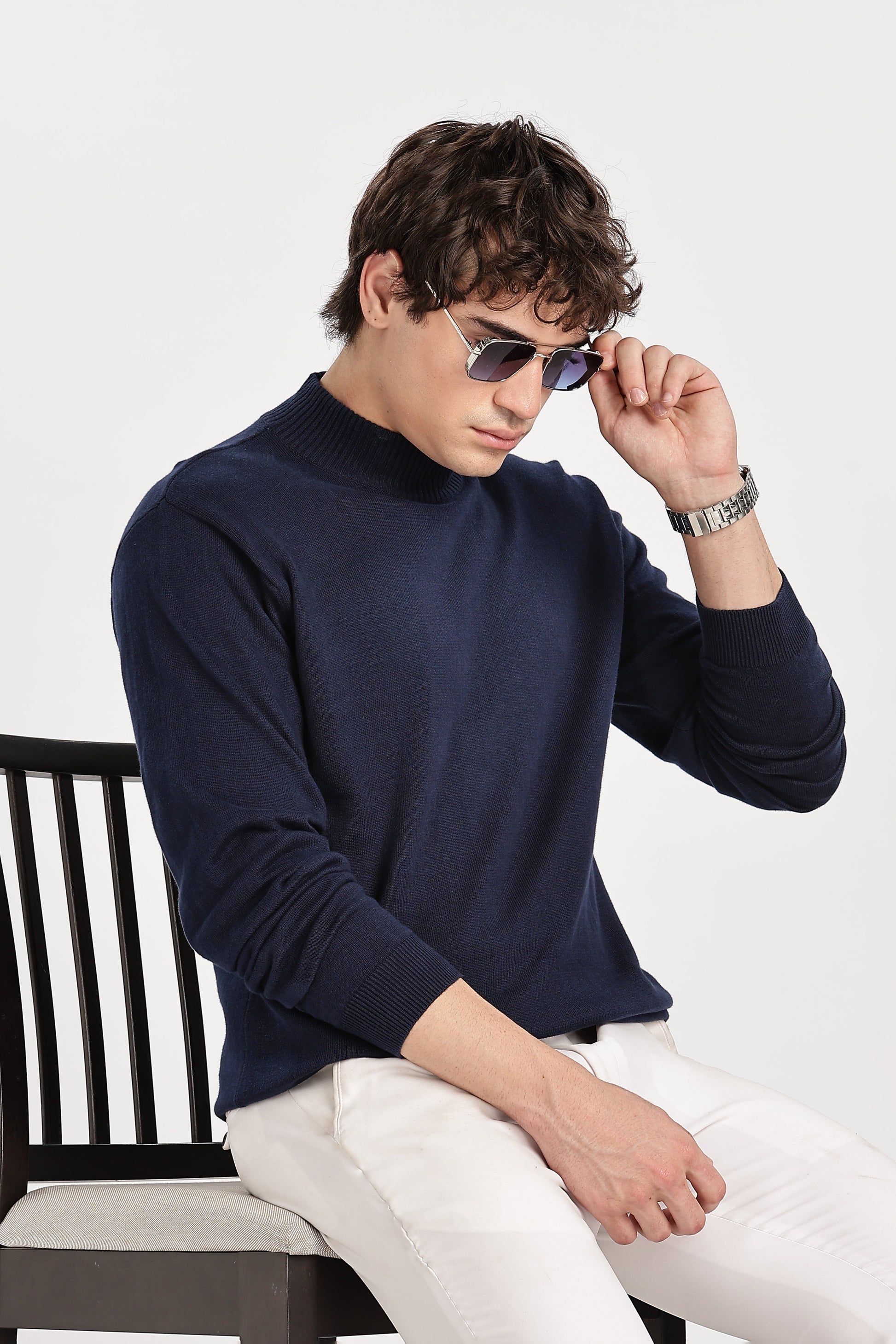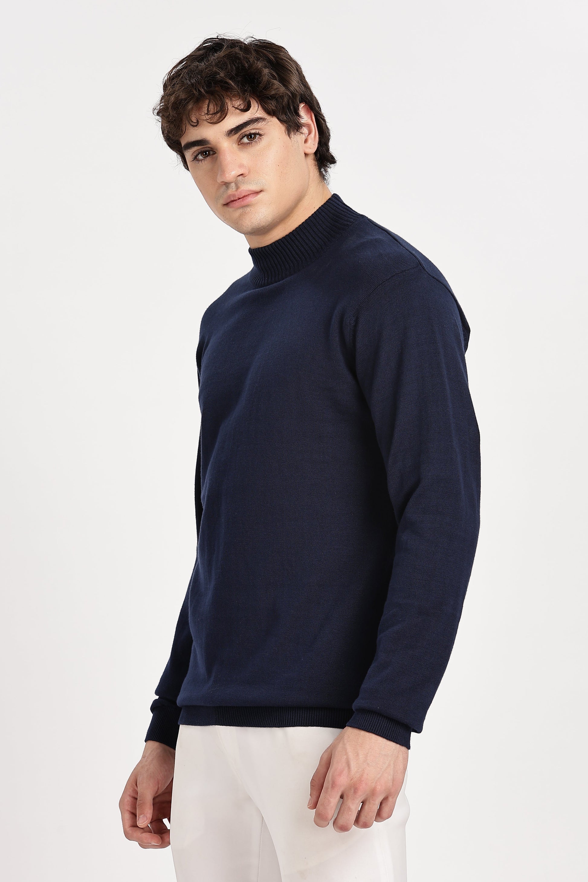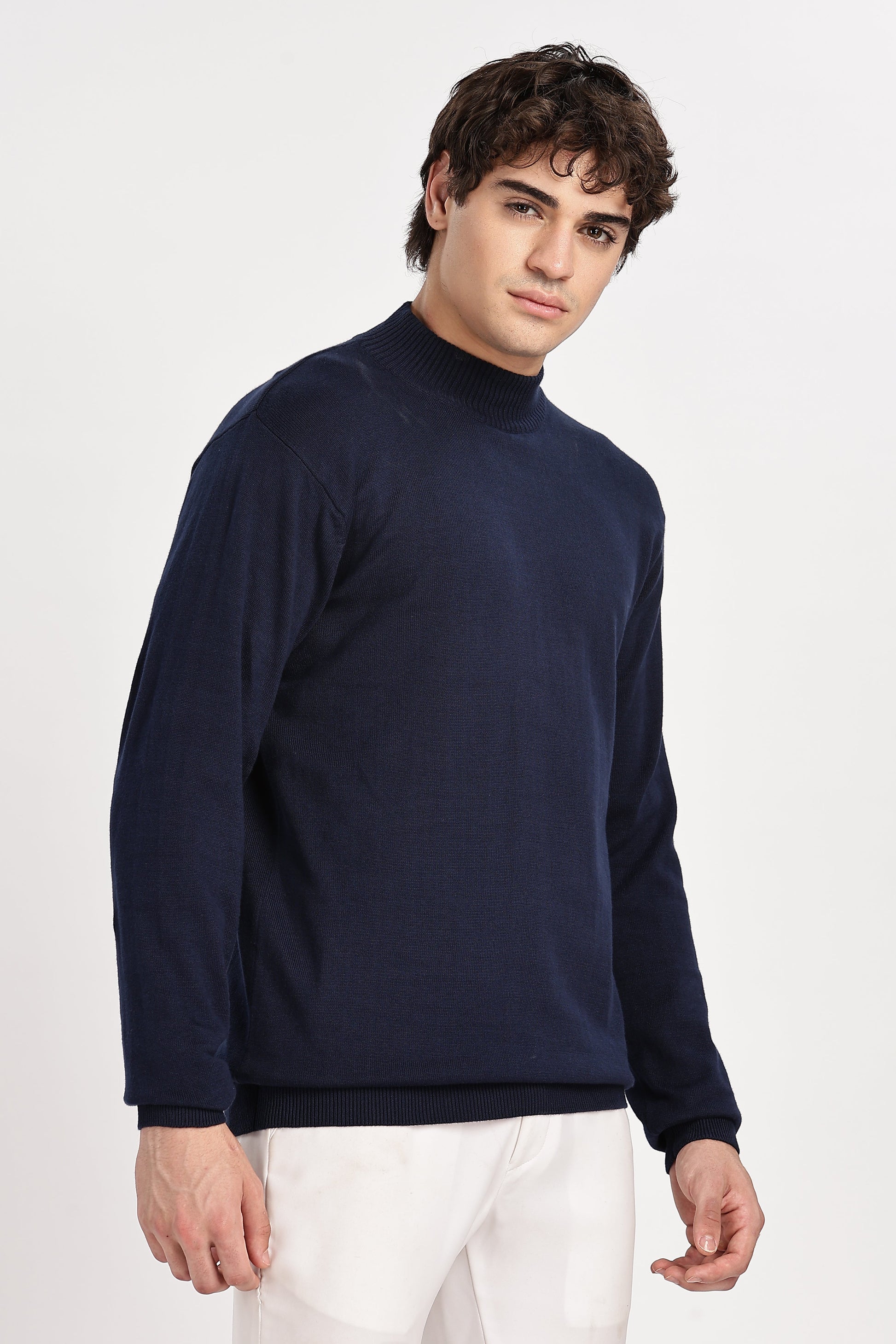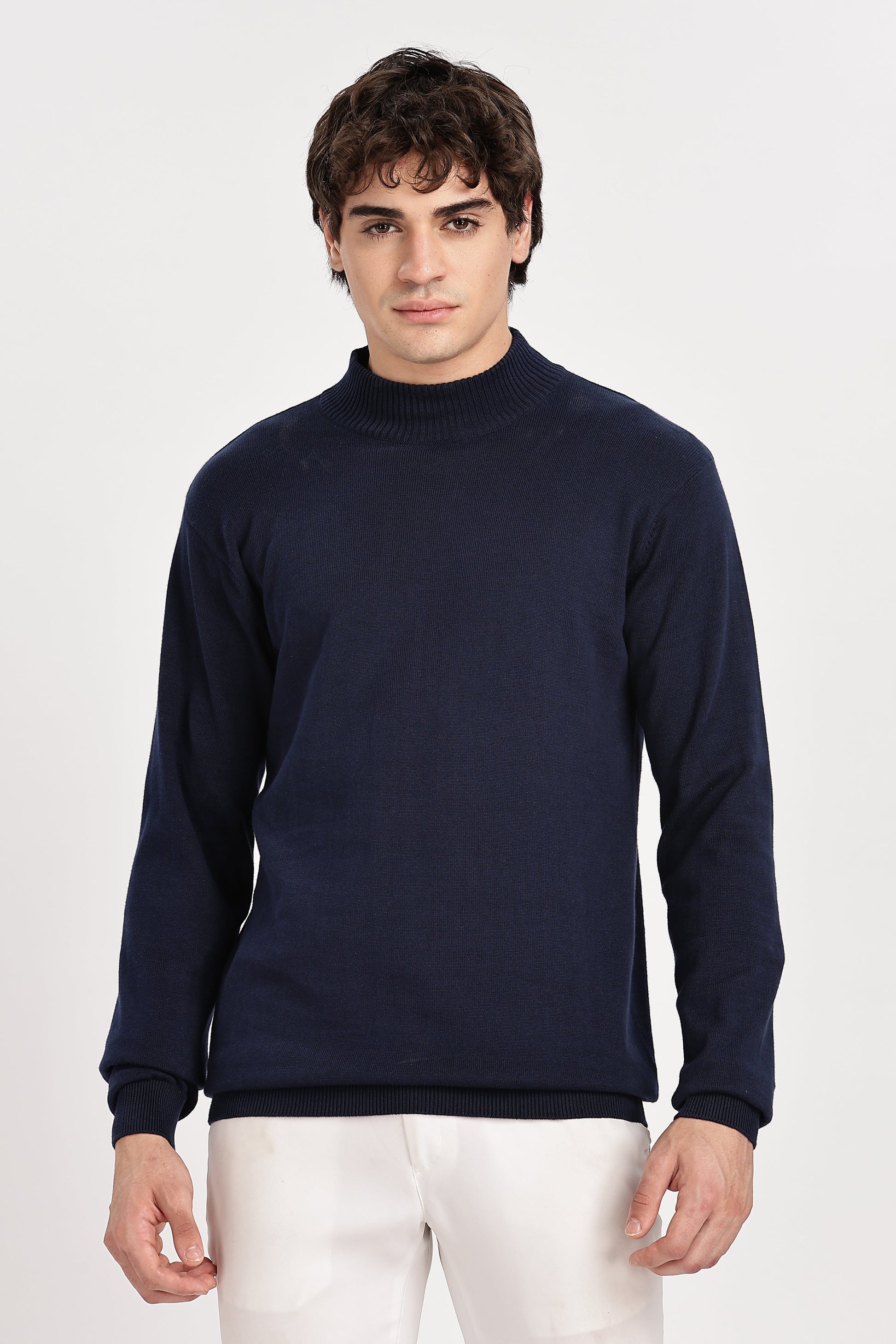 Navy Blue Men's Solid High Neck Sweater