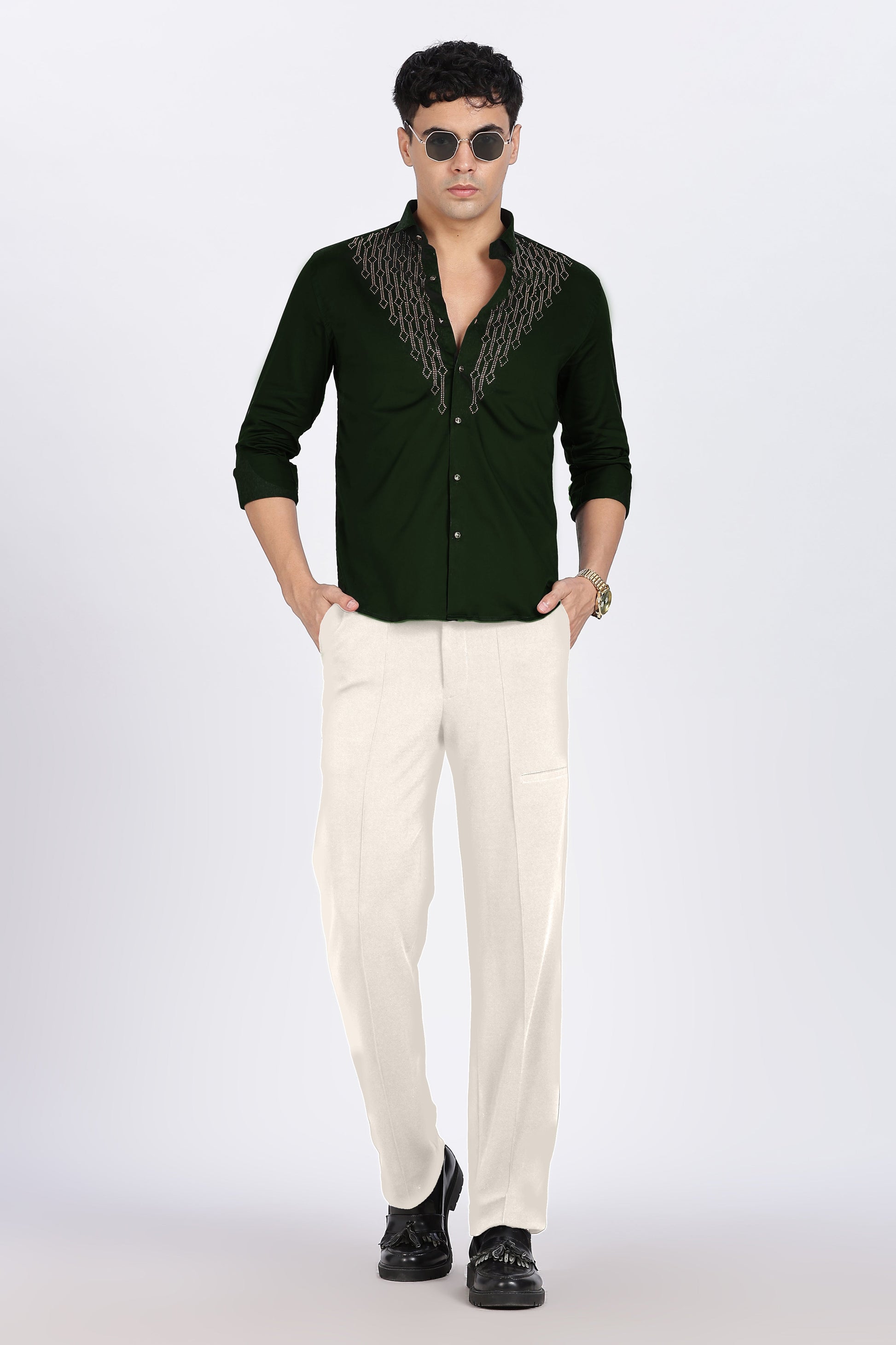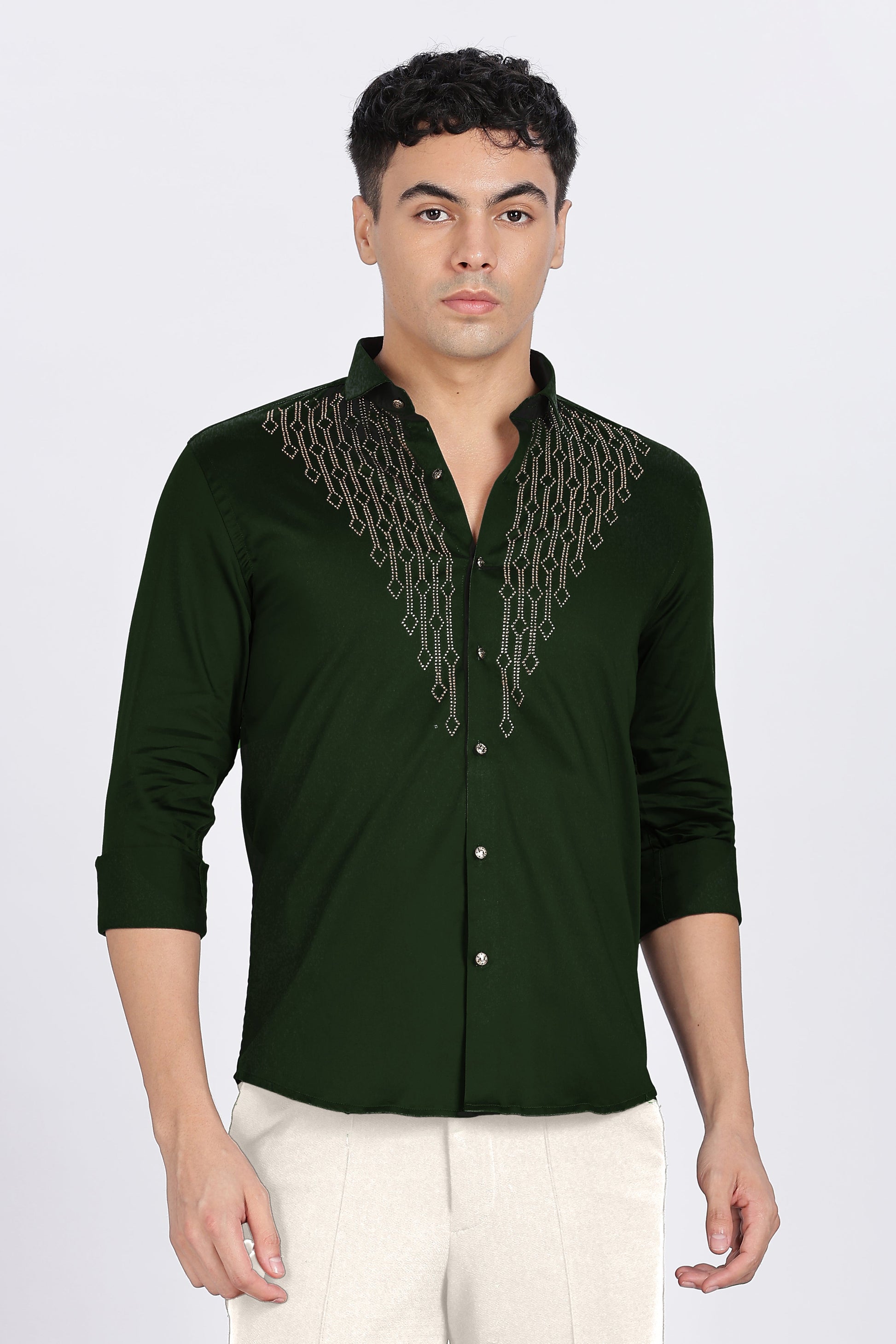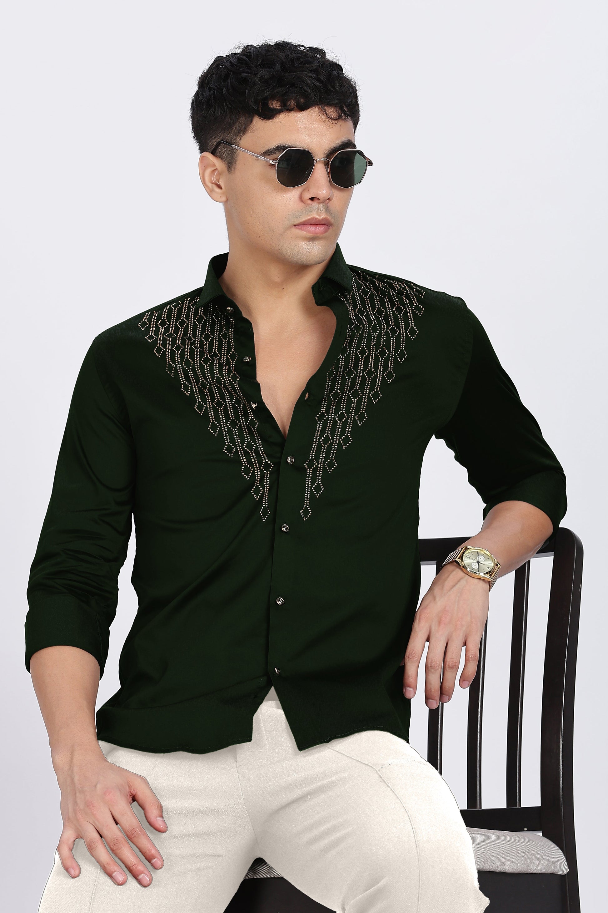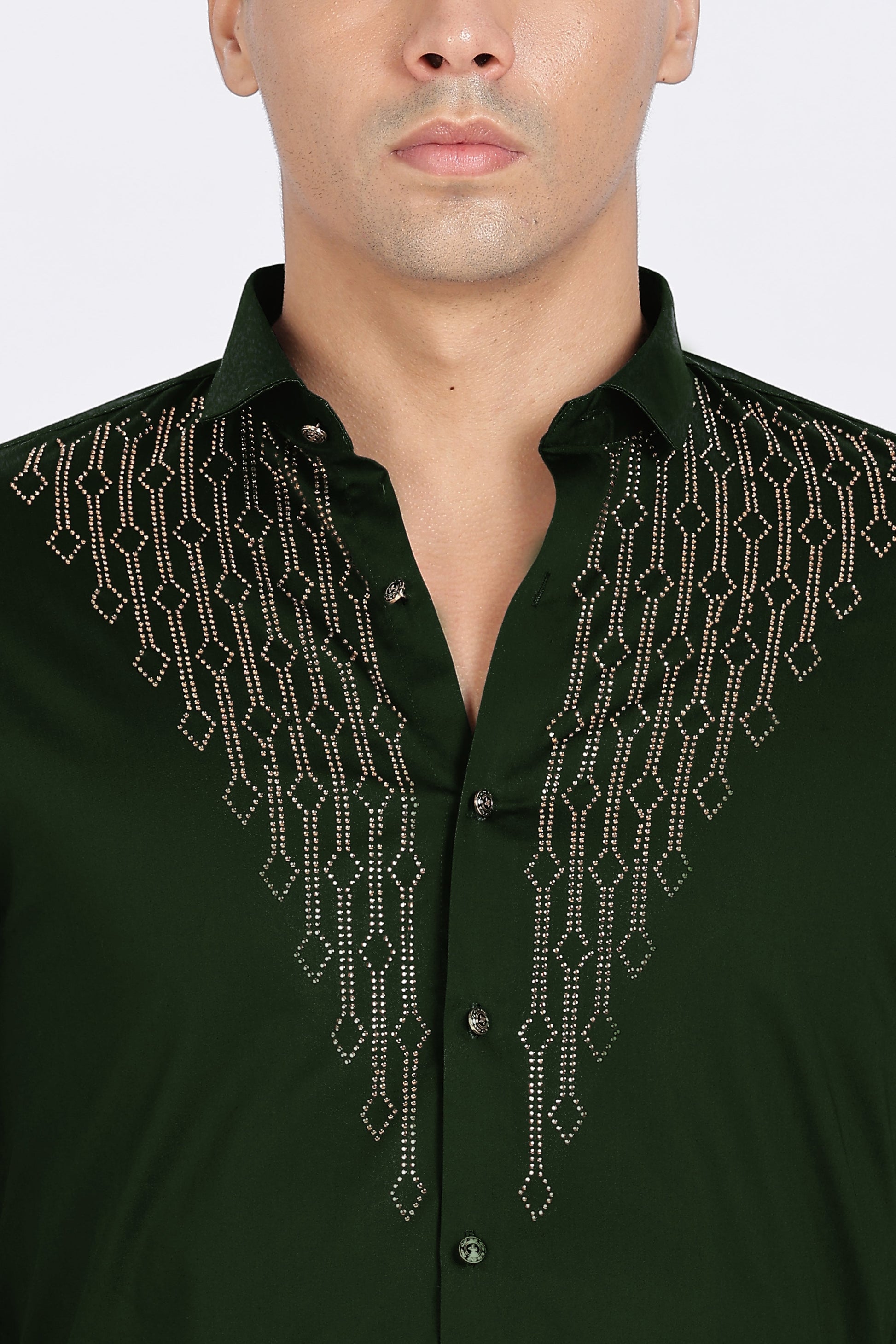 Add a touch of luxury to your wardrobe with the Green Regal Shine Shirt. Designed for men who love to stand out, this premium shirt features an elegant maroon base adorned with intricate golden stone embellishments in a striking V-pattern across the chest. The shimmering details give it a bold yet classy appeal, perfect for evening parties, festive celebrations, and special occasions.