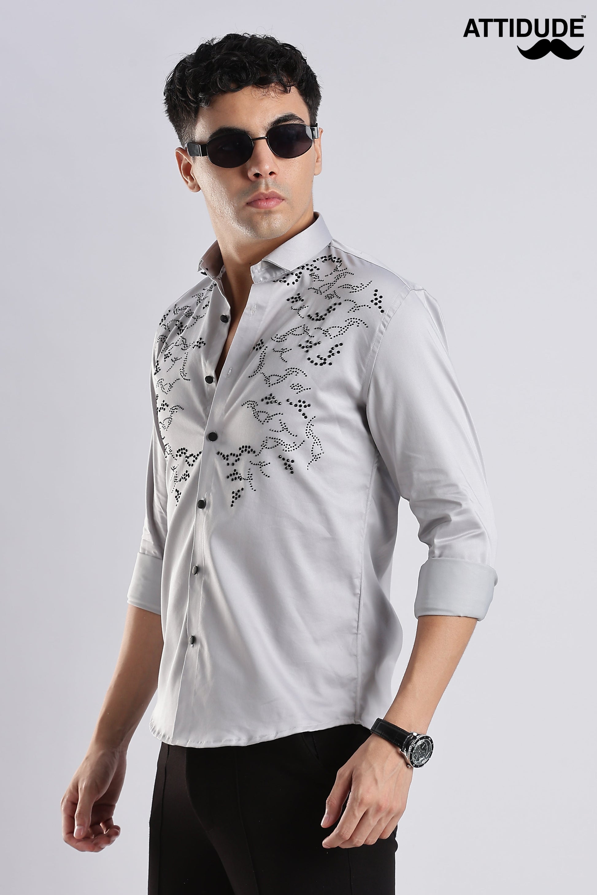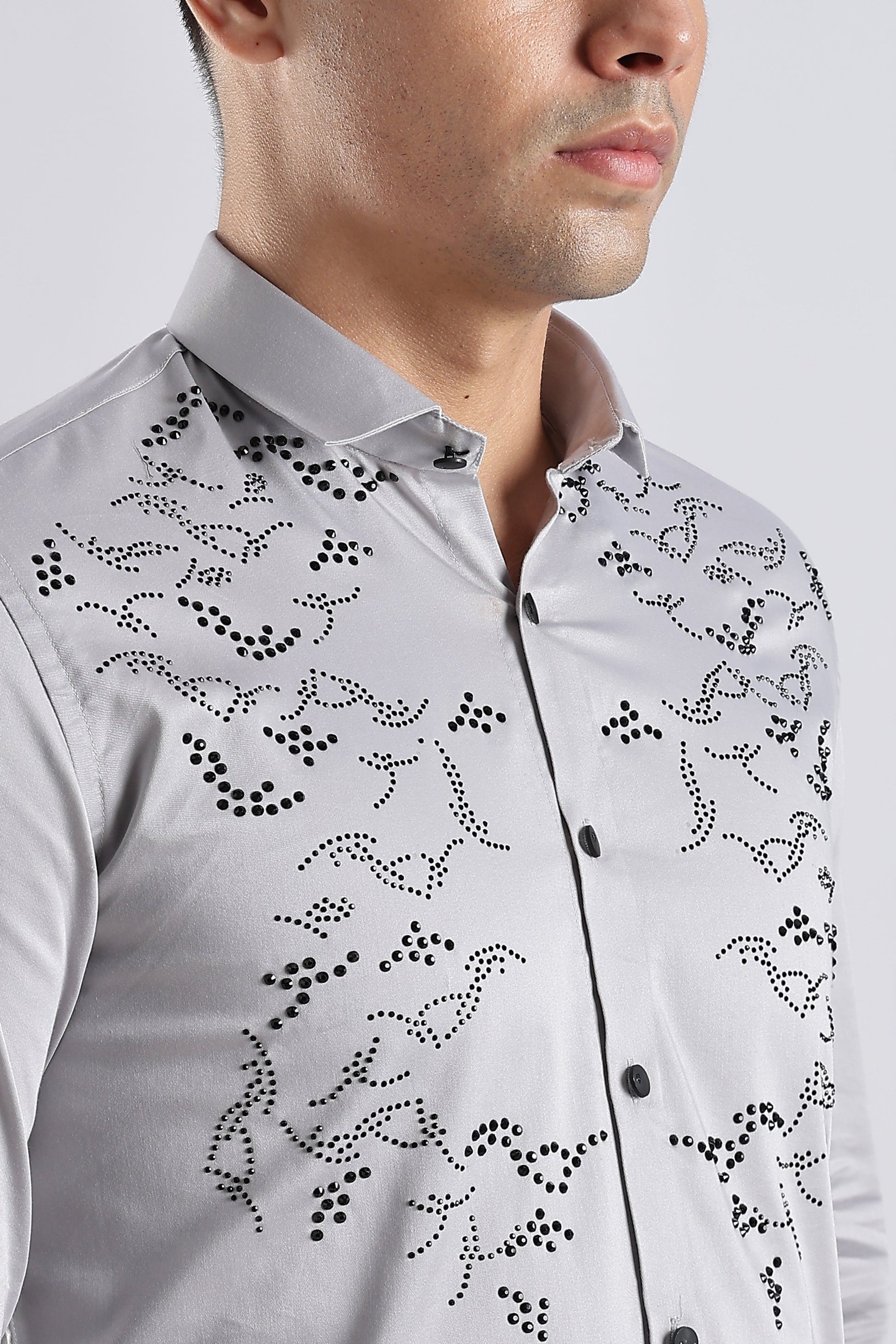 Grey men's Party wear shirt featuring intricate black embellishment, likely referred to as "stoned" due to the appearance of the embellishments, which could be small stones