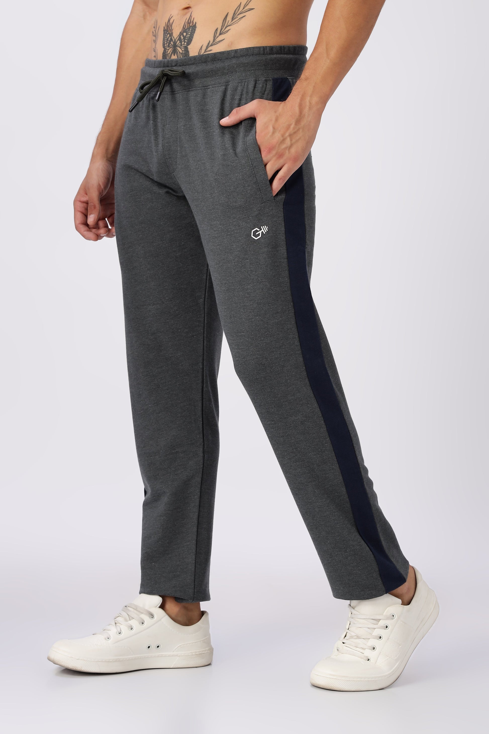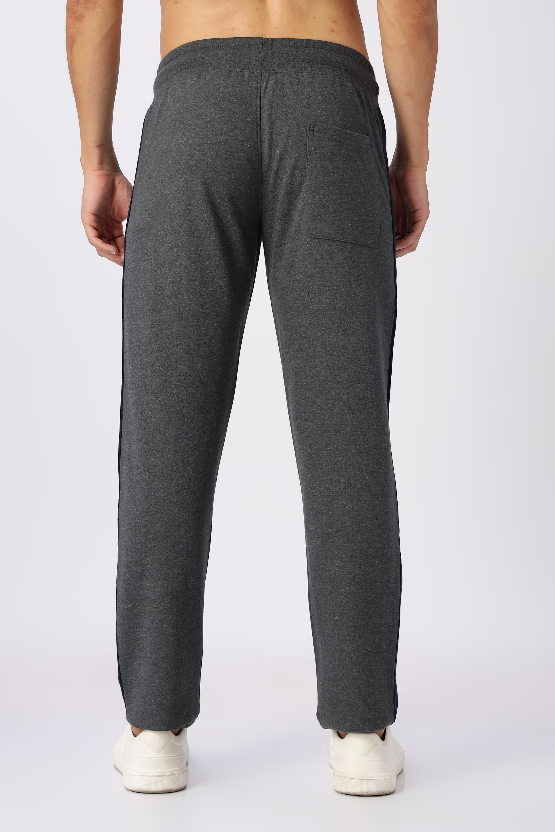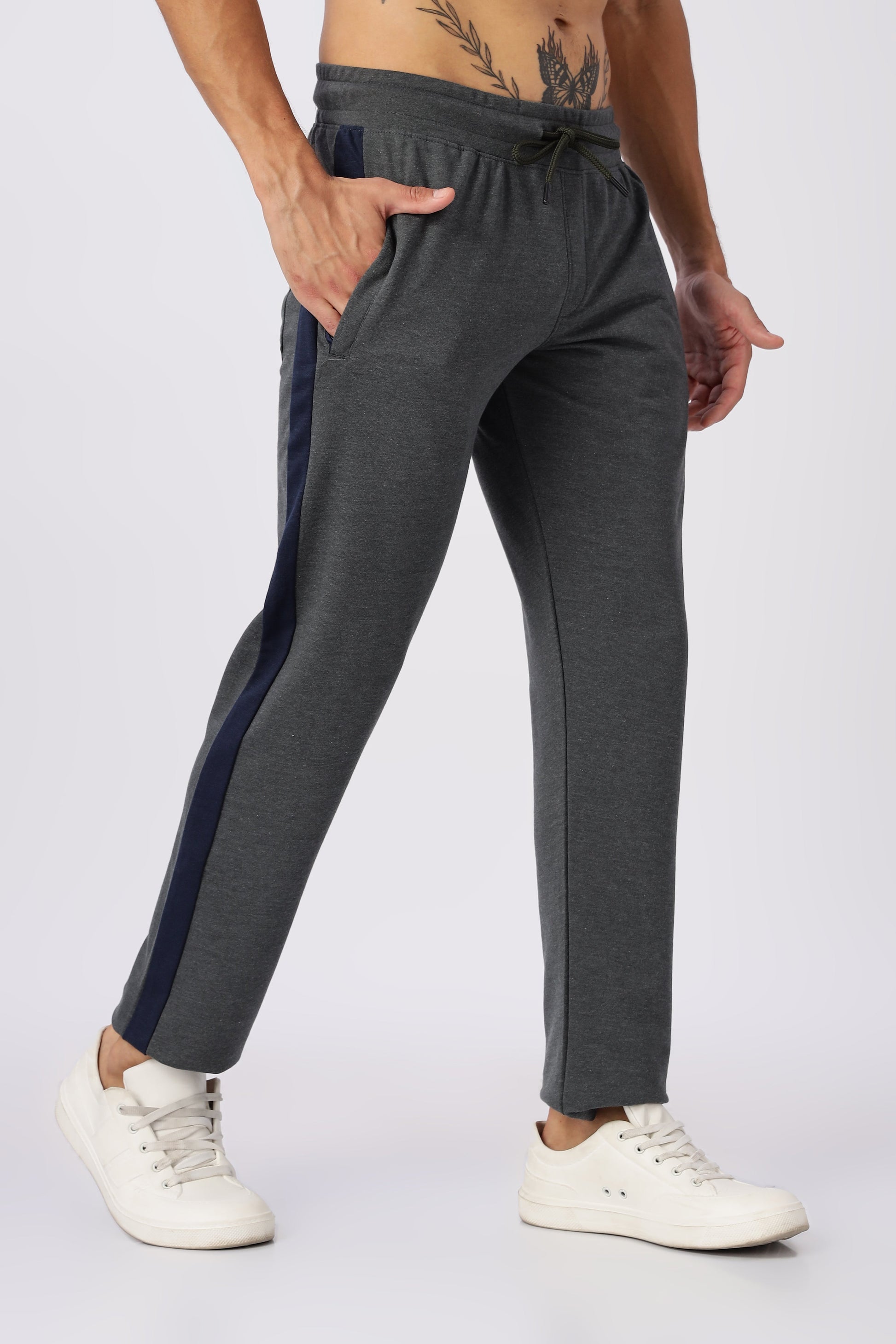 Grey Gymvampyr Track pants for men, featuring a blue stripe on the side. These pants typically have an elasticated waistband with a drawstring for an adjustable fit and are made from a soft, comfortable fabric, often a blend of cotton and polyester or materials like elastane for stretch. They are designed for activities like jogging, running, gym workouts, and casual wear, providing both comfort and flexibility. The pants often include features such as zipper pockets for secure storage.
