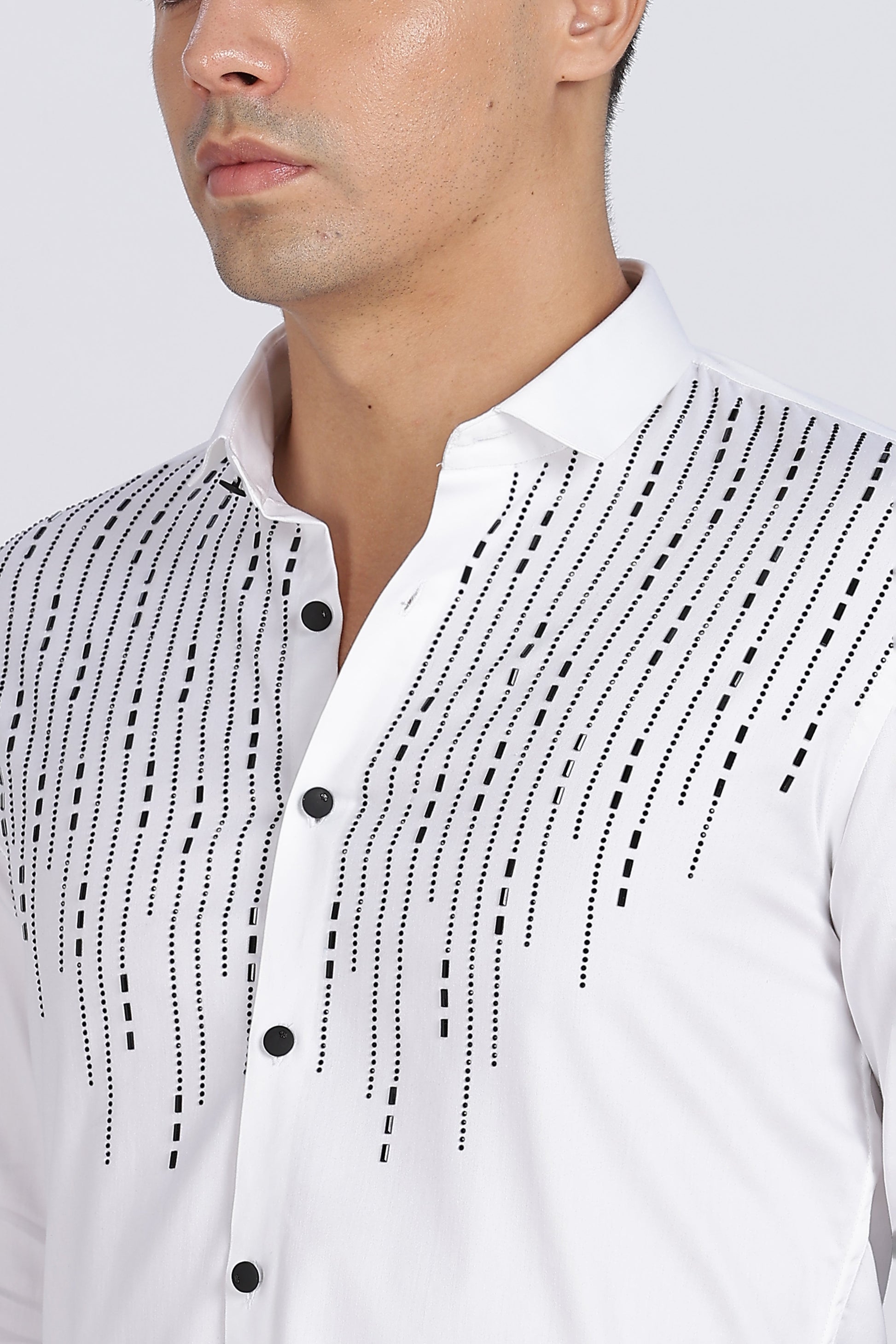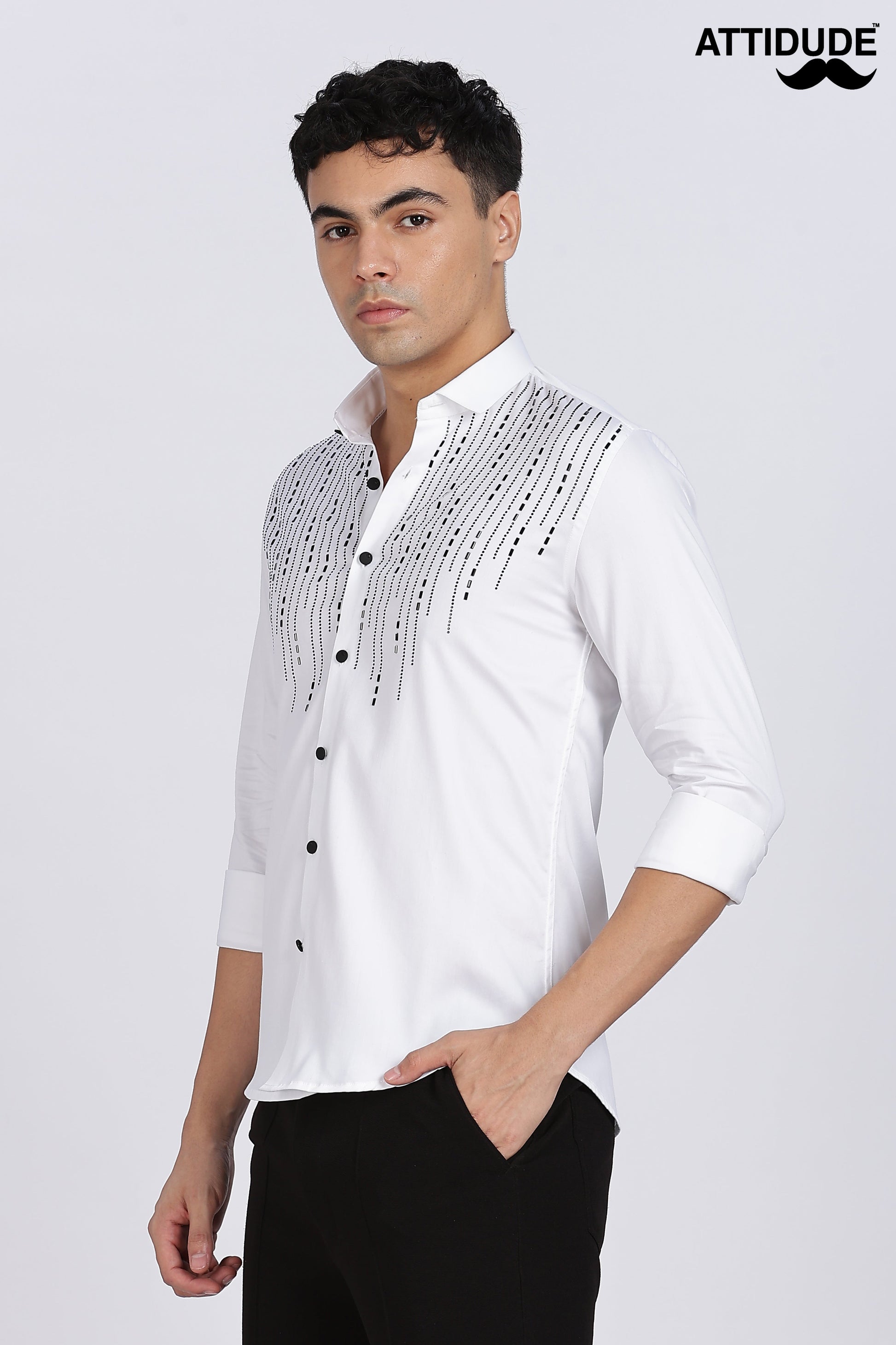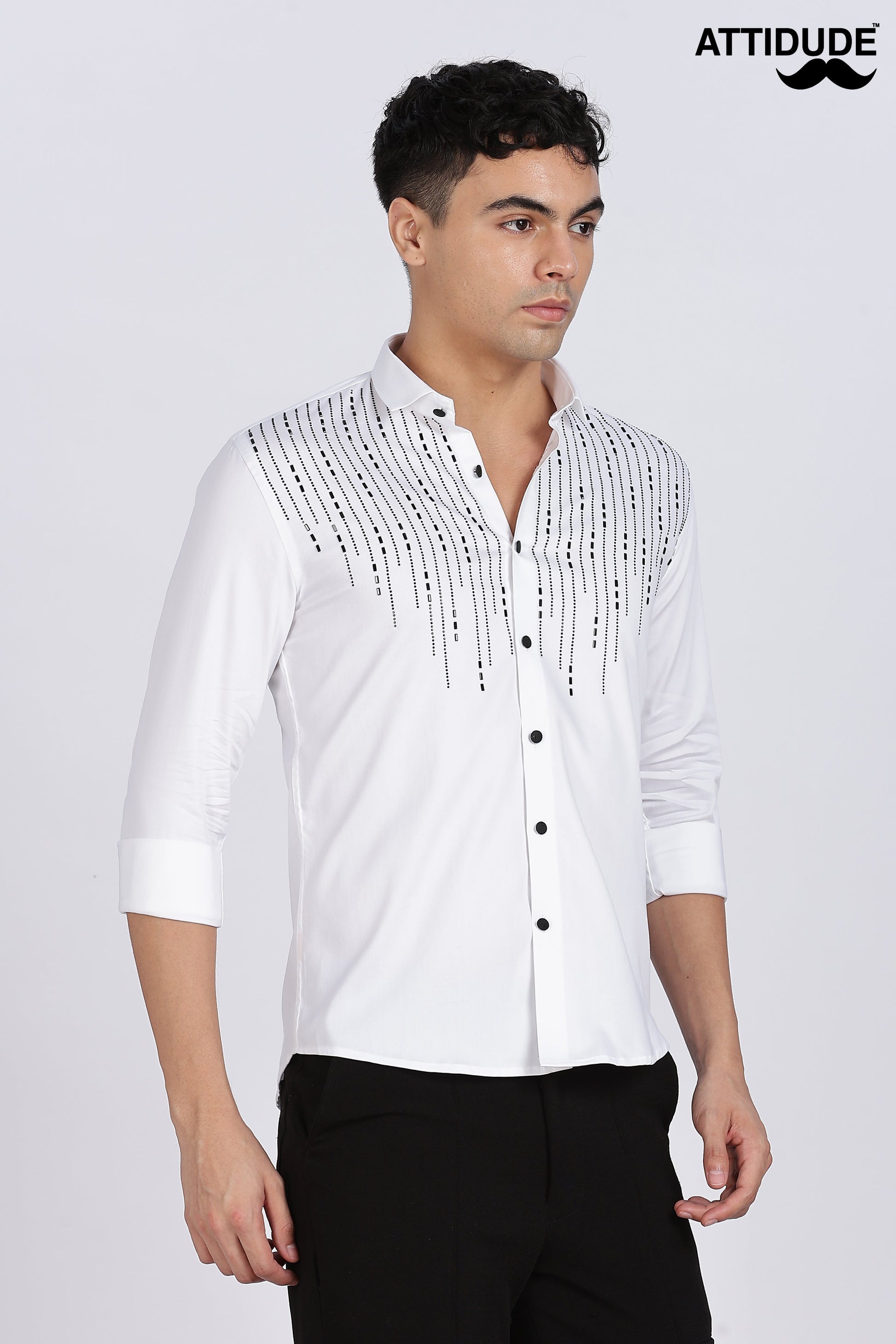 Sparkly Beaded Full Sleeve Shirt features intricate black cutdana work or beading on the shoulders and upper chest, adding a distinctive and luxurious detail design, particularly the embellishments, makes it well-suited for party wear or semi-formal events where a touch of flair is desired.